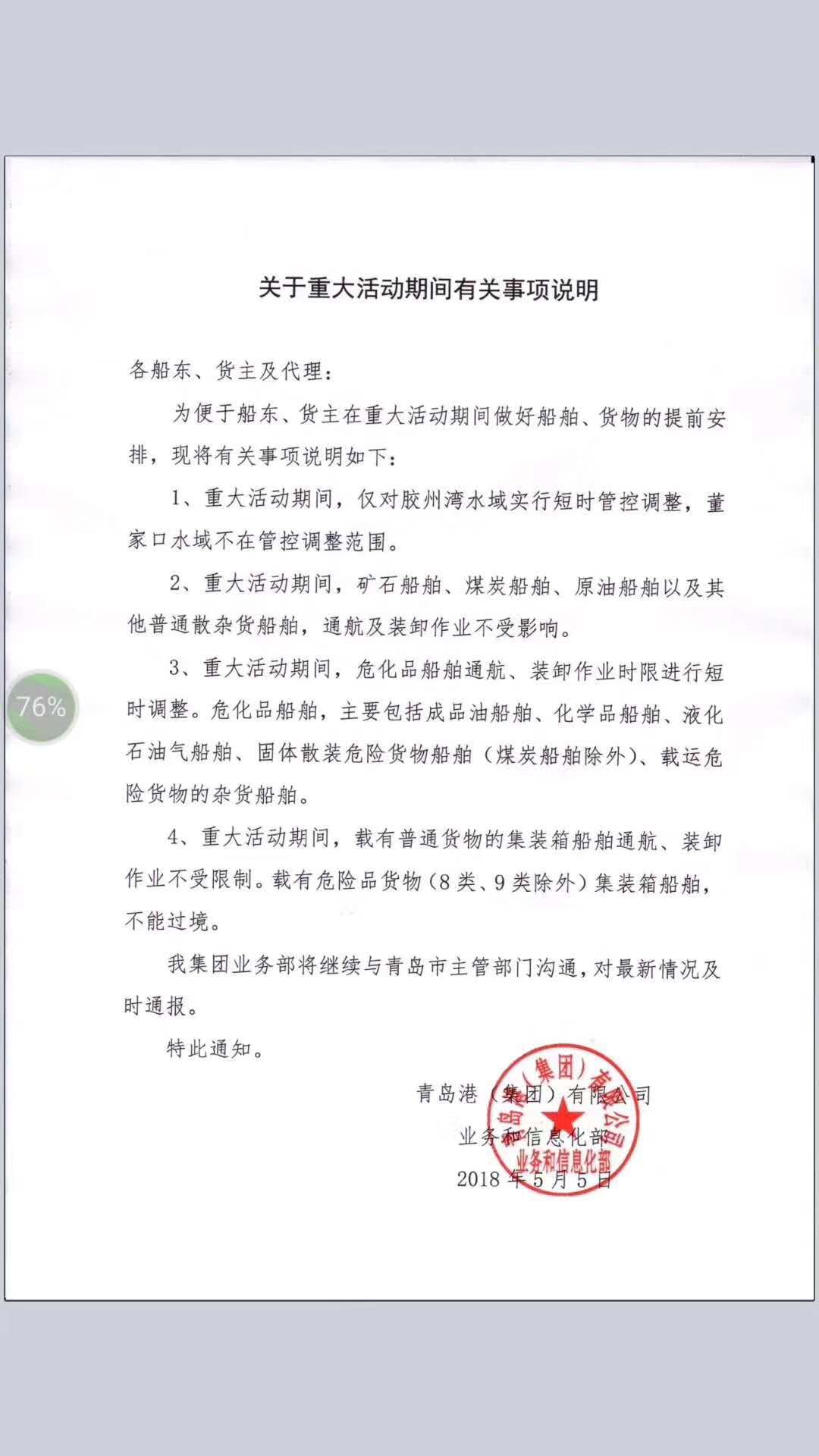 - 2018年6月青岛上合峰会期间,青岛港将暂停危险品操作
